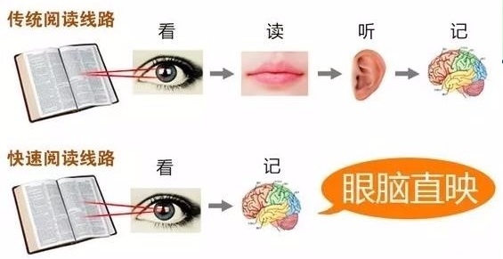 无声阅读其实是一种"眼脑直映"(运用眼和脑两大器官,省去了口的发音和耳朵的监听)的读书活动。在大多数人的习惯中,如不读出就违反了我们最习以为常的阅读习惯,也可能无法理解这些字的含义,在这个过程中:眼睛看到字形——大脑反馈出字音——大脑明确字义——最终理解文章意义,这样的一个认知过程。逍遥右脑把这个过程叫为音读。简单来说就是"字—音—听—想—理解"。默读也是一种音声化现象,不过口不出声而是在头脑中进行而已。传统的阅读方式实际是在读书,而不是看书。